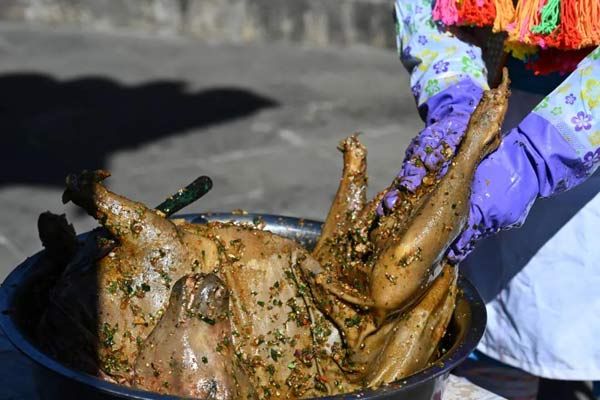腌漬的時間越長,調(diào)料越能入味,揉好鹵汁,還要腌制個把小時。房屋后面,也是一派繁忙的景象,挖土坑,摔膠泥,大家都在為這一道隆重的美食做著準備工作。全羊用野芭蕉葉、草果葉或大粽葉、大竹葉捆裹停當,用膠泥裹糊嚴實,挖一土坑,先放入一堆柴火燒起,把土坑徹底燒熱,再把土包羊放到土坑里,土包羊上下左右堆放滿柴火開始燒烤,約2小時后,木柴全部化為灰燼,然后刨土覆蓋嚴嚴實實,不能透氣絲毫。