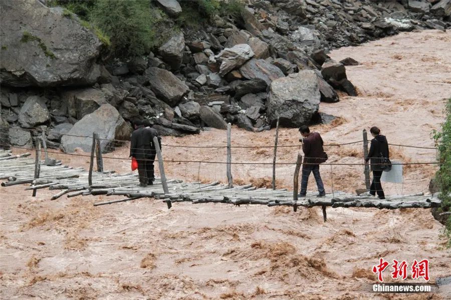 2014年,工作人員赴那曲比如縣進(jìn)行古籍普查,經(jīng)過(guò)怒江上一座簡(jiǎn)易浮橋。受訪者供圖。