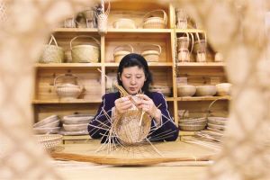 在貴州省赤水市一家竹編作坊,一名竹編藝人在編制果盤。 王長(zhǎng)育攝