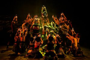在舞劇敘事方式上,總導(dǎo)演之一董華興將民族性與現(xiàn)代性相融合,嘗試時(shí)空切換,段落重組,故事情節(jié)的倒敘、插敘,真實(shí)性與虛擬性相結(jié)合等方法?!耙魳?lè)制作、舞蹈語(yǔ)匯、服裝設(shè)計(jì)等方面都要符合當(dāng)?shù)厝罕姷纳?,接地氣老百姓才?huì)喜歡?!薄缎腋;ㄉ健房倢?dǎo)演之一馬文靜說(shuō)。