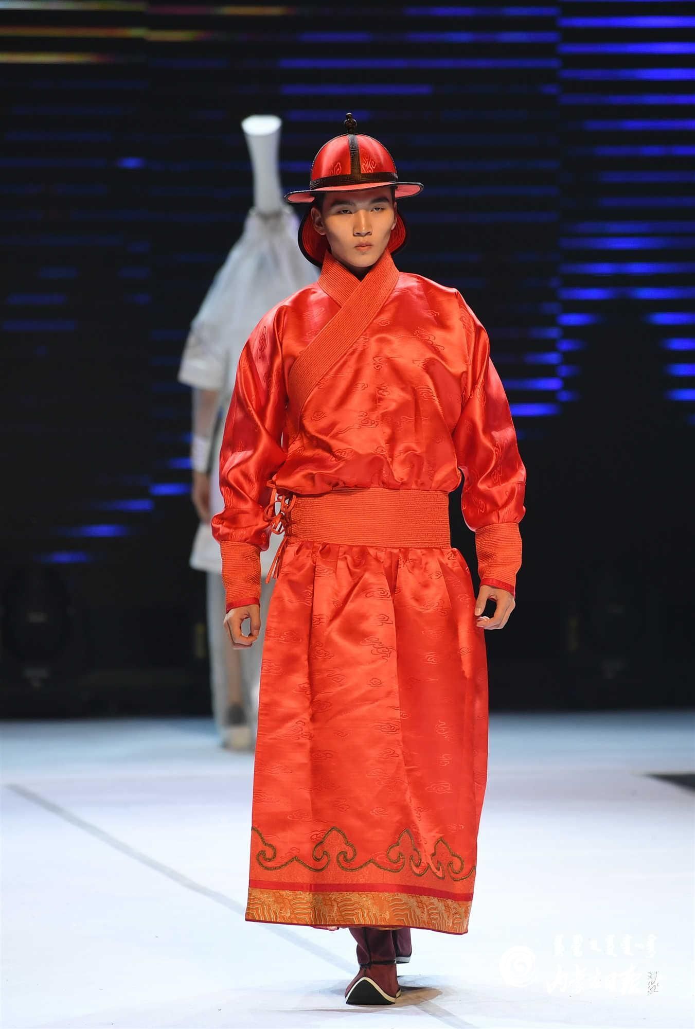 內(nèi)蒙古藝術(shù)學(xué)院的學(xué)生在舞臺上展示蒙古族禮服。
