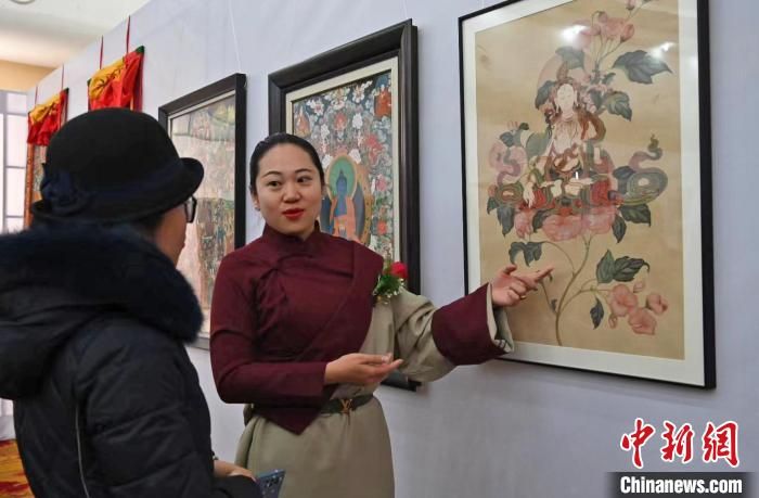 王天文是該協(xié)會為數(shù)不多的女性,自幼學習國畫。此次她的展出作品《花與佛》進行了唐卡創(chuàng)新,將漢地工筆繪法的花卉與唐卡白度母形象融合。因為熱愛藏文化,2011年她從家鄉(xiāng)河北到西藏學習唐卡,希望能探索唐卡與不同繪畫種類方式的結合。