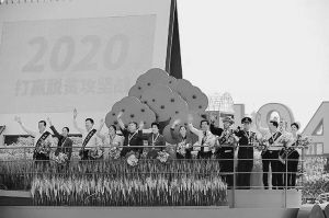 2019年10月1日,慶祝中華人民共和國成立70周年大會(huì)在北京天安門廣場(chǎng)隆重舉行。圖為群眾游行中的“脫貧攻堅(jiān)”方陣彩車。 新華社記者 李尕?cái)z