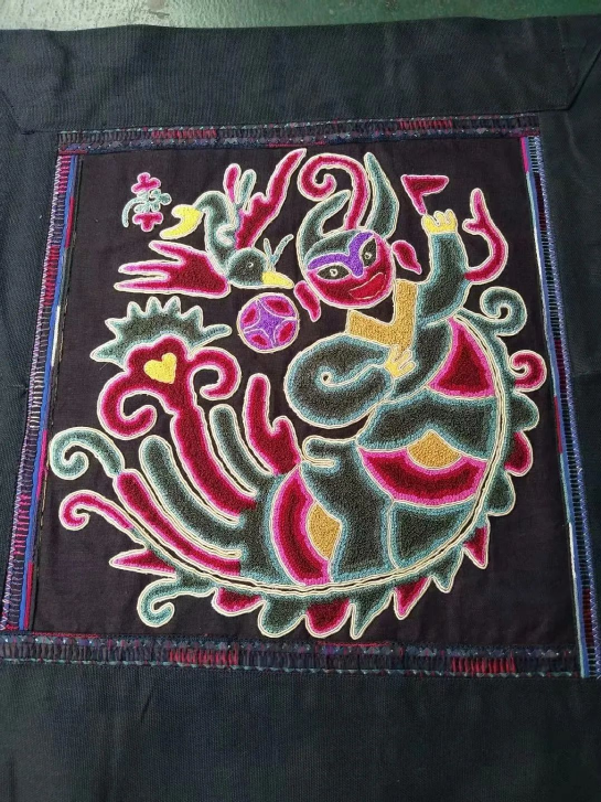 臺江苗繡的圖畫紋飾豐富,有造型獨(dú)特的飛禽走獸、花鳥魚蟲,還將人與大自然的其他動植物在繡片上融為一體,體現(xiàn)了苗族人民對自然萬物的崇拜,同時(shí)也折射出苗族屢經(jīng)遷徙的歷史變遷。