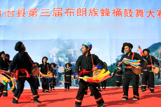蜂桶鼓舞是布朗族的群眾性舞蹈,分為三步和五步兩種。演出時,由兩名年輕男女雙手各持一條“帕節(jié)”(即毛巾)在前面跳“帕節(jié)舞”引導(dǎo),舞蹈動作主要是甩手巾。其后是蜂桶鼓隊(duì),一般為4—6只,后緊隨2只象腳鼓,之后是6人敲打的大、中、小芒和镲,最后是跟著跳舞的人們和助興的老幼。蜂桶鼓舞的節(jié)奏明快熱烈,幾種打擊樂器相配合,“嘣咚、嘣咚……嘭嚓、嘭嚓……鏘切、鏘切……”,高、中、低音融為一體,獨(dú)具情趣。動作大方、瀟灑、粗獷、活潑;舞姿輕盈、柔和、細(xì)膩。大南直布朗蜂桶鼓隊(duì)多次被邀赴省城和省外演出,向人們展示了本民族獨(dú)特的文化藝術(shù)風(fēng)采。