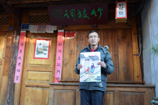 張旭東的童年,是在祖父母的耳提面命中度過的,他跟隨老人習(xí)書繪畫,學(xué)禮明俗。到了弱冠之年,他逐一拜訪古鎮(zhèn)中尚在的民國時期出生的老輩文人,向他們請教劍川白族傳統(tǒng)民俗,并做了系統(tǒng)梳理,這也為他后來繪制年畫、撰寫春聯(lián)打下扎實(shí)的理論基礎(chǔ)。