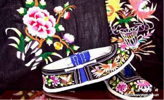 廣南刺繡歷史悠久,遍及壯鄉(xiāng)苗嶺,瑤山彝寨,街頭巷尾,處處都是刺繡的天地。壯族青年婦女的頭飾、圍腰心、圍腰頭、高綁布鞋要繡上圖案裝飾,兒童戴的貓頭帽、花風(fēng)帽、燕尾帽、月牙帽繡有花邊絲綢,帽前鑲有十八羅漢銀器像,帽的左右兩邊掛有兩串銀器以示吉祥,壯族婦女的外衣繡有三角形、四方形花紋圖案,廣南壯族人民使用的生活用品,如被套、枕巾、桌布、窗簾、手帕以及婦女背小孩的背帶、兒童披風(fēng)和靈芝鞋等都要繡上花鳥小草點綴,體現(xiàn)出美的情致。