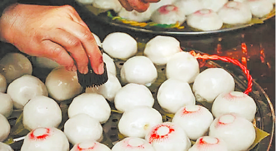 齋是將紅糖味的熟糯米包入糯米漿制成的皮里,口感香糯有韌性。除了蒸熟后直接食用,齋還有一種特殊的吃法:將其對半切后,用油稍微煎過再加紅糖水,煮成一碗甜香四溢的紅糖齋。