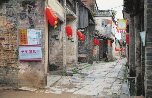 千年老街自北向南,寬約4米、長約300米,青石板路面。沿街多為典型的嶺南風格建筑,二層騎樓,房屋寬敞深長,一樓為鋪,二樓為居,前為店,后為廚。天井頂面多設(shè)明瓦數(shù)塊,以取日光照射,木梯扶手、門窗雕刻的粗細花紋無聲地證明它們曾經(jīng)的風采??吹贸霎斈昱f街果然是繁華過的,有飯館,有劇院,有酒肆,有客棧,有百貨,街道排水、布局都很合理,有的街道至今在門前仍有留有水道。
