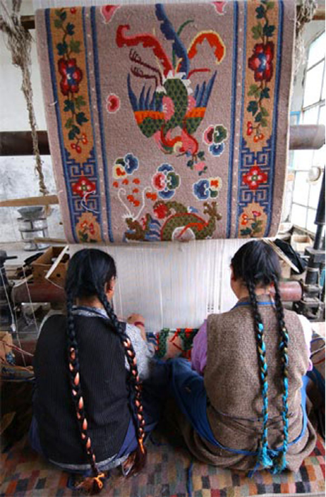 從前,“措巴”每年都要派人去拉薩專為達賴喇嘛和地方政府編織卡墊以及其他羊毛織品。十三世達賴喇嘛土登嘉措時期,江孜織工索朗多布杰手藝高超,曾為達賴喇嘛織了雙龍靠墊、凈水瓶袋等著名織品,被封為五品官。民主改革后,江孜卡墊業(yè)在中央政府的關(guān)懷下又有了新的發(fā)展,他們編織的“布達拉宮”、“珠穆朗瑪”、“萬里長城”等壁毯和地毯,是享譽國內(nèi)外的精品。