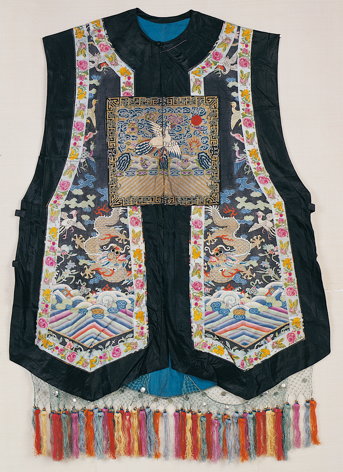 《史記·五帝本紀》載:“黃帝之前,未有衣裳屋宇。及黃帝造屋宇,制衣服,營殯葬,萬民故免存亡之難?!痹谖迩Ф嗄昵暗男率鲿r代仰韶文化時期,可能就產生了原始的農業(yè)和紡織業(yè),開始用織成的麻布來做衣服。據(jù)傳,黃帝之妻嫘祖發(fā)明了飼蠶和絲紡,衣冠服飾基本成制。殷商西周,冠服制度逐漸完善,春秋戰(zhàn)國時期,衣冠款式走向多元,冠服制被納入“禮治”范疇,從此漢族衣冠服制更加詳備。中原地區(qū)還出現(xiàn)了胡服戎裝,甚至相沿成風(圖為漢族清代七品文官女朝褂,中央民族大學民族博物館館藏)。