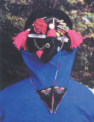 中原女子最有名的便是婚禮服的套件。平民家新娘的裝束較簡樸,以布或紅花插鬢為飾,不戴鳳冠,頂大紅蓋頭。若是名門富賈之女,則打扮得富麗,頭戴銀制九鳳冠,耳戴金環(huán)手戴玉鐲,指戴金戒指,滿身大襟繡衣,外披多瓣云肩,從中可以看出富貴和這個階層追求功名利祿的得意之態(tài)。