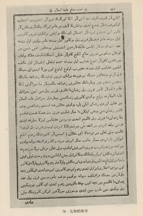 察合臺文著作。1899年喀山大學(xué)鉛印本。高25.5厘米,寬17.5厘米,共510頁。作者拉布古孜,寫于14世紀(jì)。圖為《先知薩立哈故事》中的一頁。寫的是異教徒們在魔鬼的支使下將要成為先知薩立哈的父親卡斯瓦爾關(guān)進地牢,天使奉真主之命使他逃出后與妻子見面的故事。現(xiàn)藏新疆博物館。該書語言豐富生動,屬哈喀尼耶語(后期回鶻語)和察合臺語之間的過渡語言,一定程度上反映了當(dāng)時的口語,是研究維吾爾語言史和文學(xué)史的重要資料。