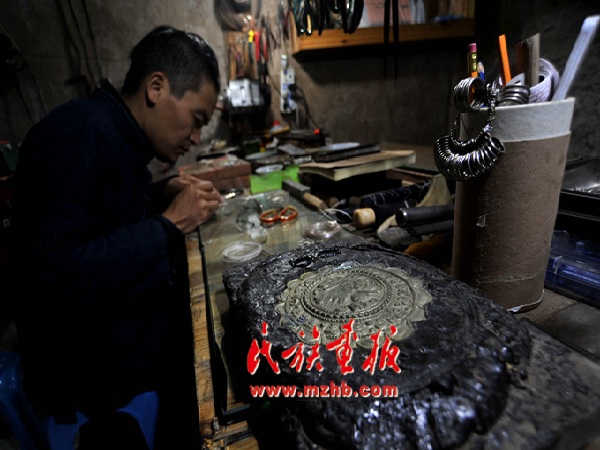將事先手工打磨好的銀絲擺放在需要鑲嵌的位置,然后用焊槍整體加溫。該過程需要嚴(yán)格控制溫度,溫度高則熔斷銀絲,溫度低則鑲嵌不牢固。制作過程最難把握的是鏨刻與焊接。鏨刻的掌握全憑手上的感覺,用力過大容易將銀片鏨通,力道不夠又不能將紋理的層次感突顯,這是檢驗(yàn)一個(gè)銀匠師傅技藝是否成熟的標(biāo)準(zhǔn)之一。