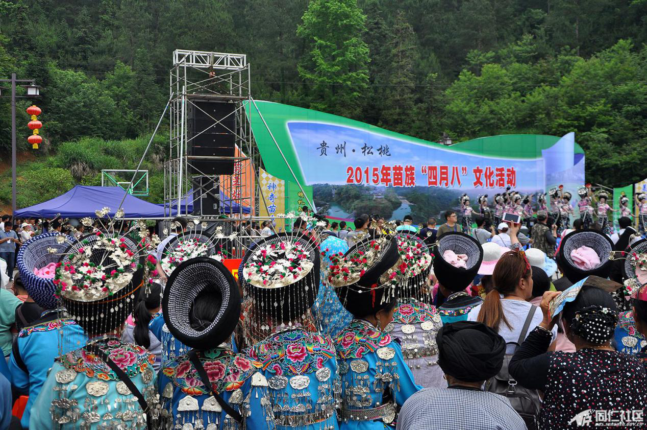 “四月八”的由來傳說甚多,主要是為憑吊“四月八”葬于今噴水池一帶的古代苗族英雄,輩輩相傳,而成習俗。傳說古代有一個名叫“亞努”的苗族首領,領導苗民向統(tǒng)治者進行斗爭。他曾組織各寨苗族頭人在“喝血坳”地主喝雞血,發(fā)誓共同聯(lián)合,戰(zhàn)斗到底。并約定四月八日在某山聚眾起義。起義后,義軍連連獲勝,一直打到了四川、貴州。第二年的四月八日,亞努不幸戰(zhàn)死在貴陽市的噴水池附近。苗族人民為了紀念這位民族英雄,便于每年的四月八這一天,舉行紀念活動,追思亞宜的業(yè)績,為戰(zhàn)死者掃墓。清代乾嘉苗民起義后,統(tǒng)治者禁止湘西苗族人民舉行這一活動,新中國成立后經(jīng)國家民委批準,將“四月八”定為苗族統(tǒng)一的節(jié)日(圖為2015年貴州松桃苗族“四月八”節(jié)慶盛況,引自貴州銅仁政府網(wǎng)“同仁社區(qū)”)。