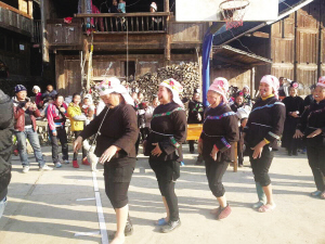 據(jù)當?shù)卣辖榻B,毛坪村過苗年跳蘆笙,歷來都是光腳跳。寨老茍吳說,光腳板跳,才接地氣,才能碰觸到列祖列宗的靈魂,與祖先共舞。傳統(tǒng)蘆笙舞跳完,當?shù)貗D女還要舉行“大女子主義”舞蹈表演。這種舞蹈,最大特征就是婦女們把男性的一面以夸張的手法表現(xiàn)出來。領隊的婦女要口叼長煙斗,臉畫長胡子,左腳光腳丫,右腳穿鞋,邊走邊舞,滑稽無比。隊后的婦女,雙腳不能穿同樣的鞋,嘴叼香煙,“裝模作樣”,妙趣橫生。這種滑稽舞蹈,引來全寨村民和賓客歡笑,整個村寨其樂融融。