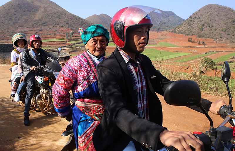 依布底一起去踩花山的人組成長(zhǎng)長(zhǎng)的摩托車隊(duì),老阿婆腰桿筆挺盛裝坐在摩托車后座上。等他們來(lái)到大布紅村的花山場(chǎng)時(shí),那里早已人山人海,空地上山坡上也擠滿了衣著鮮艷的人群。