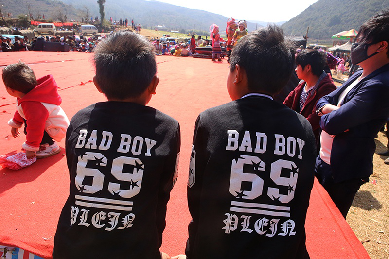與女性不一樣,這里的男性不講究穿苗服。大多數(shù)苗族年輕男子如今都在城里打工,他們更愿意展現(xiàn)自己個(gè)性時(shí)髦的一面,印有外文字母的休閑衣服受到格外的歡迎。新潮的西服皮鞋,嬉皮的休閑牛仔,紋身,墨鏡,耳釘,項(xiàng)鏈……我發(fā)現(xiàn)幾乎所有的年輕男子都會(huì)在自己的頭發(fā)上做點(diǎn)文章,而今年的潮流似乎偏向夸張的美感。