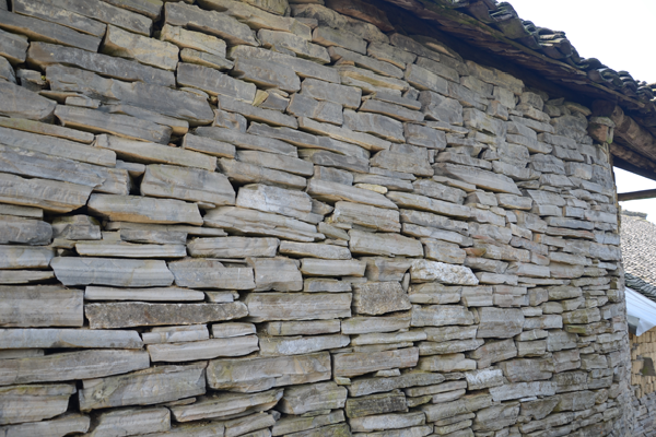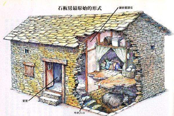 石板房以石條或石塊砌墻,墻可壘至5至6米高;以石板蓋頂,風(fēng)雨不透??傊?,除檁條、椽子是木料外,其余全是石料,甚至家用的桌、凳、灶、缽都是石頭鑿的。一切都樸實無華,固若金湯。這種房屋冬暖夏涼,防潮放火,相對采光較差。