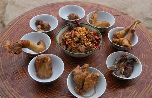 “雞八塊”是指雞身上的八個(gè)主要部位,即:頭、腳(又稱大腿)、小腿(大腿的上節(jié)、布依族稱為“卦”)、爪、翅、尾、腸、肝。