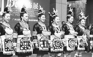 2015年5月23日,由貴州省民族博物館、廣西民族博物館和上海紡織博物館聯(lián)合主辦的“絢彩中華——中國侗族服飾文化展”在上海紡織博物館舉行。本次展覽共展出近200件套侗族服飾,代表了不同時代、不同地域、不同支系、不同功能的侗族服飾。展期為期60天。圖為來自貴州黎平縣三龍村的侗族姑娘們,邊唱著侗族大歌,邊向觀眾們展示美麗的侗族服飾。