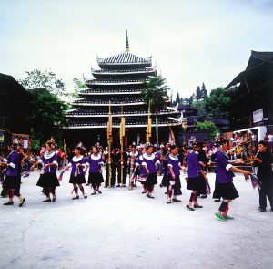 侗寨鼓樓前的表演。侗家把鼓樓當(dāng)做遮蔭樹,既是侗寨的象征,也是氏族的標(biāo)志。因此,所有鼓樓都是全寨人集資、出力興建的,大一點(diǎn)的村寨按居住范圍會(huì)建幾座鼓樓。