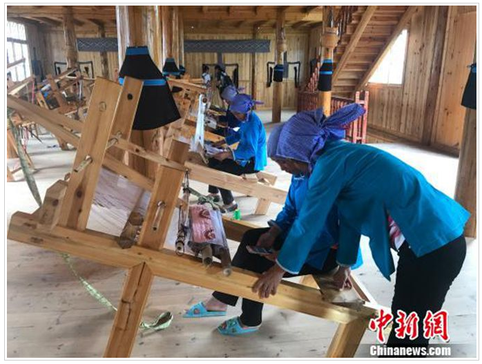 聽聞姐姐在這里織錦每月可拿到3000多元的收入,今年7月,此前在廣東務(wù)工的文坡村二組村民龍練霞干起了這份家門口的工作,再也不想外出了?!凹确奖阏疹櫦胰?,又可以抽空干點(diǎn)農(nóng)事?!苯衲?0多歲的龍練霞說。和她一樣,看到侗錦的銷路慢慢打開了,村里許多在外務(wù)工的年輕人也紛紛返鄉(xiāng),拾起祖輩們的老手藝。