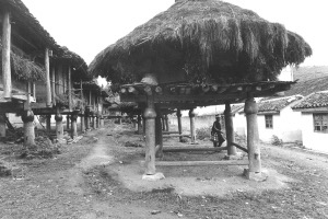圓倉底部用4根木柱支起,4根木柱之間距離相等,成正四方形,圓柱底部用木板鑲嚴(yán)實,以避免糧食下漏、透風(fēng)、受潮。建于村旁戶外的圓倉,一般都具有防水、防鼠、防潮等多種功用。