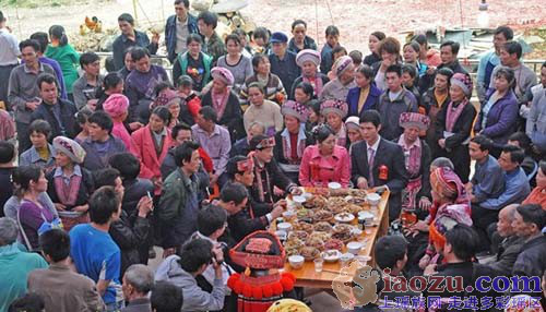 接著就是用美味佳肴盛情款待“親家客”。午餐和晚餐時(shí),新郎方的客人(叫“老房客”)派出代表(男陪女,女陪男)用大碗酒和大塊肉陪“親家客”飲酒吃肉,大有不把“親家客”灌醉不休之雄心。晚宴過后,親朋好友們都會(huì)圍著篝火,開始對(duì)歌,內(nèi)容大多是對(duì)新人的夸獎(jiǎng)和祝福,如““十五的月亮明又亮, 小伙子就像月亮一個(gè)樣,黑夜里有顆星, 它像姑娘一樣靚,瑤家姑娘作新娘, 美麗得像蝴蝶,新郎也不遜色喲, 如胸前的銀牌一樣閃光輝。”等等。