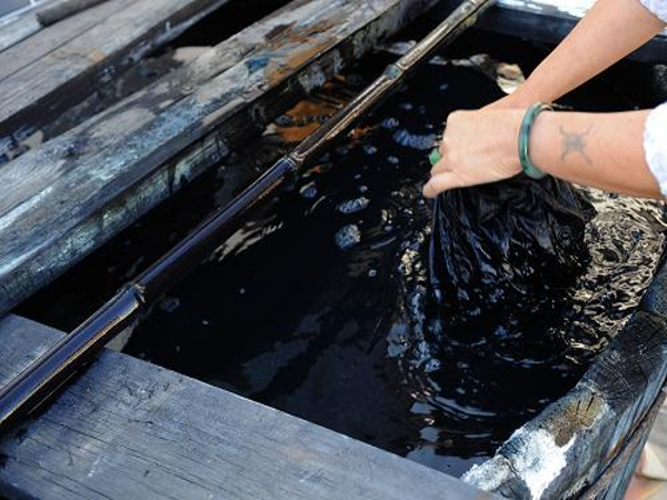白族扎染的染料來(lái)自蒼山上生長(zhǎng)的寥藍(lán)、板藍(lán)根、艾蒿等天然植物。用得最多的是板藍(lán)根,以前用來(lái)染布的板藍(lán)根都是山上野生的,多年生草本,開(kāi)粉色小花,后來(lái)用量大了,染布的人家就在山上自己種植,好的可長(zhǎng)到半人高,每年三四月間收割下來(lái),在松木桶中漚制成染料。