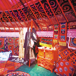 氈房外觀通常樸實(shí)無華,門框由松木做成,上面雕刻花紋或繪制圖案,一塊鮮艷奪目的掛毯吊在門上。房?jī)?nèi)富麗堂皇,布置合理,前半部分堆放日用物品,后半部分待客、住人。