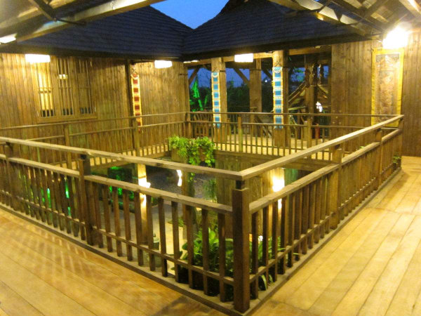 上層近梯處有一露臺,轉(zhuǎn)進(jìn)為長形大房,用竹籬隔出主人臥室并兼重要錢物存儲處。其余為一大敞間,屋頂不甚高,兩邊傾斜,屋檐及于樓板,一般無窗。若屋檐稍高則兩側(cè)開有小窗,后面開一門。樓中央是一個(gè)火塘,日夜燃燒不熄。屋頂用茅草鋪蓋,梁柱門窗樓板全部用竹制成。