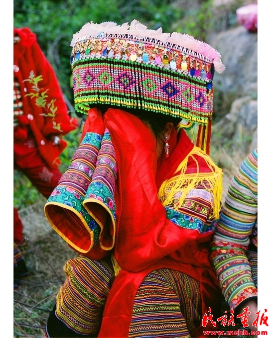 刮臉回來后,張正秀就由姐妹陪伴在閨房。屋外送親的酒席在熱鬧中開席時,舅母就回到閨房里為她洗臉洗腳,改換嫁衣。按傳統(tǒng)習俗,要把新娘用過的水潑灑在閨房的地上,以示吉利。新娘穿上由親人縫制的繡花衣裙,從頭到腳煥然一新。穿戴整齊后,新娘由伴娘陪同坐在閨房門旁的草地上接受祝福。女方家請的懂禮儀的阿巴莫(司儀)手持菜花和松針葉在堂屋敬女方家神,告訴家神姑娘要出嫁了,并給前一天夜里來新娘家領(lǐng)親的兩位娃拿扒(證婚人)挎上兩條交叉打結(jié)的紅布,表示娃拿扒已承諾為女方家領(lǐng)親。