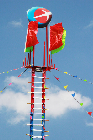 2011年,緬甸傈僳學(xué)會在密支那舉辦了第一屆世界傈僳闊時(shí)節(jié),第一次將十幾米高的弩弓木雕作為會徽。該木雕高高聳立于密支那郊區(qū)闊時(shí)節(jié)會場,還有印有傈僳族徽的紅旗插滿會場四周,高高飄揚(yáng),與巨型木雕相互輝映,構(gòu)成了一個(gè)以弩弓木雕為核心,族徽紅旗環(huán)繞的闊時(shí)節(jié)會場空間。其內(nèi)其外,傈僳族空間與非傈僳族空間區(qū)隔明顯。