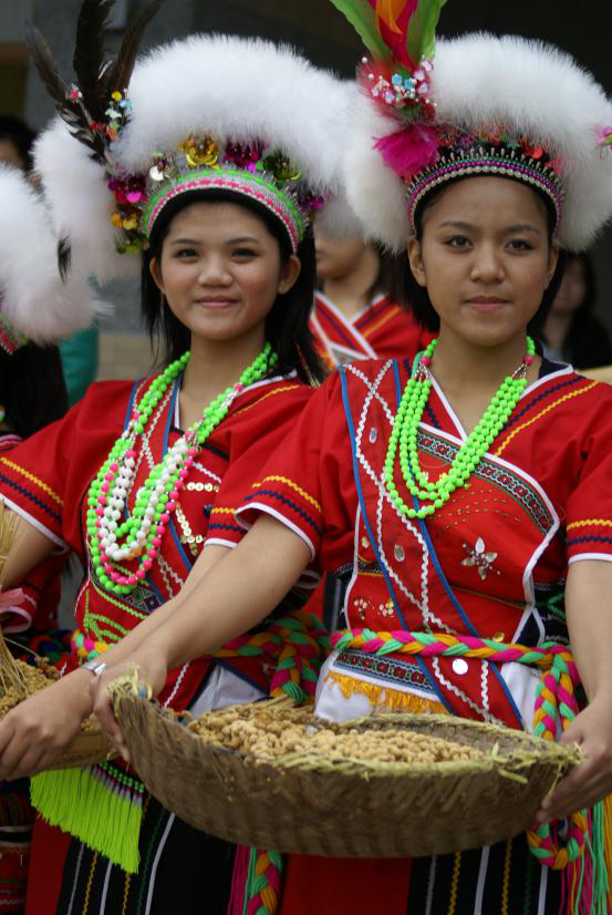 高山族過去以裸身為美,裸形赤足,僅以獸皮、樹皮及植物纖維制作的幅布蔽體,有鑿齒、穿耳的習(xí)俗。接觸漢文化后,逐步形成了男著長(zhǎng)衫、女著裙裝的習(xí)慣,衣服除了獸皮和樹皮外,還喜好用自織麻布,飾以彩色紋樣。