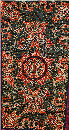 而在背兒帶下部的中心圖案則是一個(gè)古老的傳統(tǒng)紋樣。主體形象以同心圓為主,里面的幾何裝飾圖案依次向外擴(kuò)散,就像太陽(yáng)的光芒一樣向四周散射。圓是一個(gè)太陽(yáng),里面有一棵樹,即小孩的生命樹,寓意生命之樹長(zhǎng)青,樹上有一顆石榴花,寓意多子。太陽(yáng)周圍彩帶狀紋樣代表雷鳴與閃電。雷神的地位在水族社會(huì)中是至高無上的,能主持正義、懲惡揚(yáng)善。背兒帶上繡雷鳴便是祈求雷神對(duì)幼兒的庇佑。太陽(yáng)紋與雷神的象征圖案組合,是水族自然神崇拜信仰的寫照。太陽(yáng)圖案上下繡有兩只大蝴蝶,左右各繡一只老鷹。下部的四角是葫蘆紋,葫蘆的形象源于水族的創(chuàng)世神話。天地初始之時(shí)洪水泛濫,作為水族先人的兄妹二人為了躲避洪水,棲身于一支大葫蘆中,直至洪水退去。兄妹二人走出葫蘆,結(jié)為夫妻,繁衍生息,才有了今日成千上萬的水族兒女。于是,葫蘆被賦予了繁衍、生殖的意義。