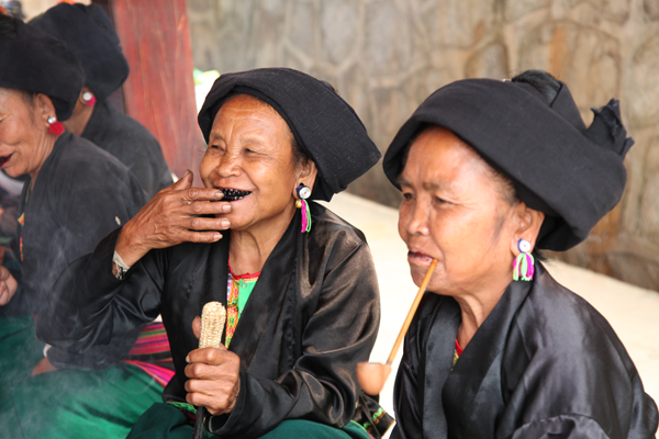 婦女的衣裙與傣族相似,上穿緊身短衣,頭頂挽髻,用頭巾纏頭,喜歡戴大耳環(huán)、銀手鐲等裝飾。姑娘愛戴野花或自編的彩花,將雙頰染紅。一般,女子上著左右兩祚斜襟窄袖黑色小褂,小褂為圓領、緊腰、寬擺,短及臀部,在左肋下拴線打結,已婚婦女用黑色布料,未婚姑娘喜淺藍色或白色。里衫為無袖貼身夾衫,下穿兩條筒裙,內裙為白色,外裙有兩色,臀部以上為紅色橫條,腿下為綠色或黑色,用布條或花邊鑲飾。未婚婦女用黑或藍布包頭;已婚婦女梳發(fā)髻,插銀簪,頂端鑲3顆棱形玻璃珠,下系銀鏈,纏包頭。婦女戴銀耳環(huán)、項圈、手鐲等飾品。
