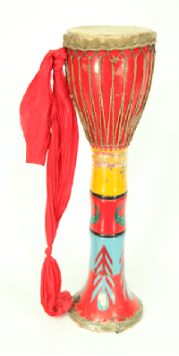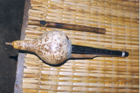 阿昌族的樂(lè)器主要有竹琴、洞簫、葫蘆簫(右圖,劉軍攝)、三月簫、銅口弦、三弦、象腳鼓(下圖,蒙哥提供)、铓鑼等。葫蘆簫是用葫蘆連接三根竹管制成的,它有7個(gè)音,音量小,音調(diào)低緩圓潤(rùn),一般晚上用。三月簫用一根竹管制成,也有7個(gè)音,它的音量大,音色細(xì)亮,多在白天使用。葫蘆簫和三月簫不僅是阿昌族人民心愛(ài)的傳統(tǒng)樂(lè)器,還是男女青年傳情示愛(ài)的媒介。