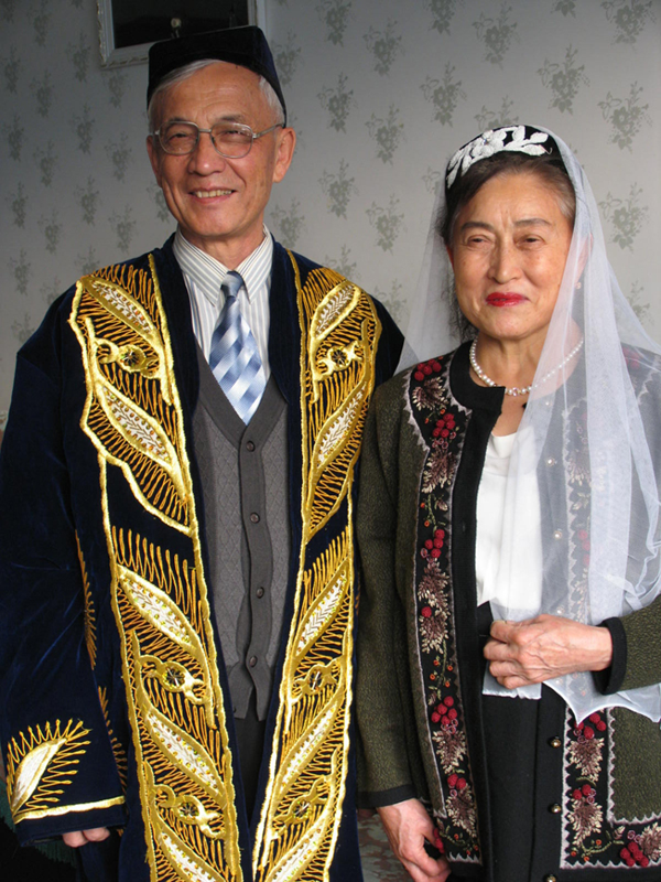 烏孜別克族男子的傳統(tǒng)服裝是一種長度過膝的長衣,長衣有兩種款式,一種為直領(lǐng)、開襟、無衽,在門襟、領(lǐng)邊、袖口上繡花邊。信服上有花色圖案,十分美觀;另一種為斜領(lǐng)、右衽的長衣,類似維吾爾族的“袷袢”。腰束三角形的繡花腰帶,一般年輕人的腰帶色彩都很艷麗,所穿領(lǐng)邊、袖口、前襟開口處都繡著紅、綠、藍(lán)相間的彩色花邊圖案,表現(xiàn)了烏孜別克族工藝美術(shù)的特點。老年人卻愛穿黑色長衣,腰帶的顏色也偏于淡雅。烏孜別克男女傳統(tǒng)上都愛穿皮靴、皮鞋,長靴外面還常穿膠制淺口套鞋,進(jìn)屋時脫下套鞋,就可以不把泥土帶進(jìn)屋內(nèi),十分衛(wèi)生。