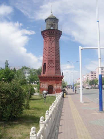雙塔,距紅樓不遠,是于19世紀末和20世紀初兩名烏孜別克族商人捐建的“宣禮塔”。雙塔呈鐵紅色,造型峻拔,塔身上的磚雕,菱形、圓形、六角星圖案美感別具風味,圓形琉璃的塔頂,亮如翡翠,通過塔座上的小木門可登上塔頂。這座雙塔體現(xiàn)了典型的俄羅斯建筑風格。