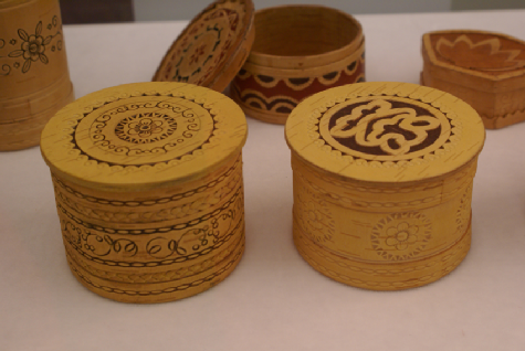 鄂溫克族的雕刻包括骨刻、木刻與樺樹皮刻。骨刻的工具是鐵制刻刀。骨刻制品一般有筷子、衣扣、板指、使用馴鹿時所用鞍子的配件、縫衣物時為拉緊線而用的拉線棒等,不同的用具上刻有不同的花紋。木刻的工具也是鐵制刻刀。木刻一般多用于神像、刀柄、煙鍋和白樺木制的馴鹿鞍具、背夾上。一般的花紋有“奧豪爾”,這種花紋有勾有彎,仿松樹形狀,有馴鹿不會跑掉的意思。背夾上的花紋則是犭罕 、馴鹿、松鼠、天鵝等。樺樹皮雕的工具用犭罕骨制成的刀,分二、三、四齒幾種。雕刻時,先用小刀或錐子把圖案輕輕畫在樺樹皮上,再用犭罕骨刻刀耐心地刻出花紋圖案。圖案一般有云卷紋、菱形紋、水波紋、花鳥等。用顏料涂上藍(lán)、紅色,使圖案呈現(xiàn)出色彩對比和立體感。鄂溫克族樺樹皮制品有盆、碗、盒、桶、箱等多種多樣,其制品本身就是非常古樸風(fēng)雅的藝術(shù)品,再雕刻上各種花紋圖案,倍添精致、美觀。
