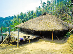 云南省潞西市三臺山鄉(xiāng)的德昂族居住分散,村寨很小,大都建在高半山上,山路行車?yán)щy。傳統(tǒng)住房為正方形干欄式竹木建筑,房屋兩層,為木柱結(jié)構(gòu)框架,竹篾編片圍墻,粗竹劈壓成自然的竹片做樓板,屋頂苫草排,當(dāng)?shù)厮追Q“草帽頂房?!?/p>