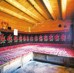 聚居新疆維吾爾自治區(qū)昌吉回族自治州奇臺縣大黑溝村農(nóng)牧區(qū)的塔塔爾族有兩種住房。一種是厚木板做墻壁的木刻楞房,另一種是平頂土房。木刻楞房建在平整的土臺上,房前設(shè)立木柱成廊道,只在前面設(shè)玻璃窗。板壁直角切半榫頭相搭,涂紅油漆。棚頂以粗大木檁密搭于板壁上,形成緩斜坡,不用椽子,直接以木板蓋頂。室內(nèi)彌漫著淡淡的松香味,以木板搭炕,中間立一細(xì)木柱,板炕上鋪花氈,被褥疊在墻角,墻邊立幾個靠墊,使坐靠更舒適。進(jìn)門正廳隔出的一小間,是方便老人起居生活的臥室。