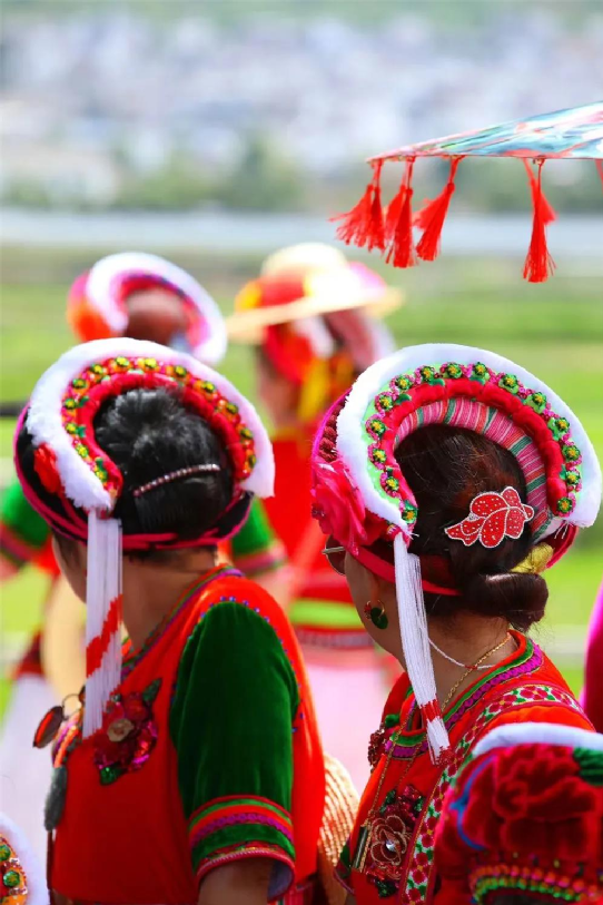在白族女子的包頭頭飾上,蘊(yùn)含著一個大家非常熟悉的詞語:風(fēng)花雪月。垂下的纓穗象征下關(guān)的風(fēng),艷麗的花飾象征上關(guān)的花,帽頂?shù)臐嵃资巧n山雪,彎彎的造型是洱海月,足見白族群眾的精巧靈思。