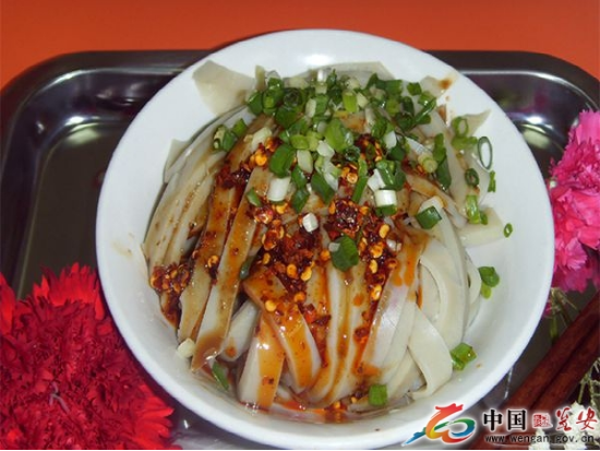 貴州甕安的豌豆涼粉獨(dú)具特色,歷史悠久,據(jù)說它的產(chǎn)生也有200年歷史。豌豆涼粉制作特別,工序多、時間長,技術(shù)十分精巧。它的原料是豌豆,吃豌豆涼粉之所以考究就在于它不用醬油,也不直接放食鹽調(diào)味,而是用特別的加了鹽的風(fēng)豆豉醬。食用時,可用刀切成條、塊、片、絲狀盛在碗里,配以蔥花、姜米、蒜水、紅油辣椒和風(fēng)鼓醬涼拌即可。