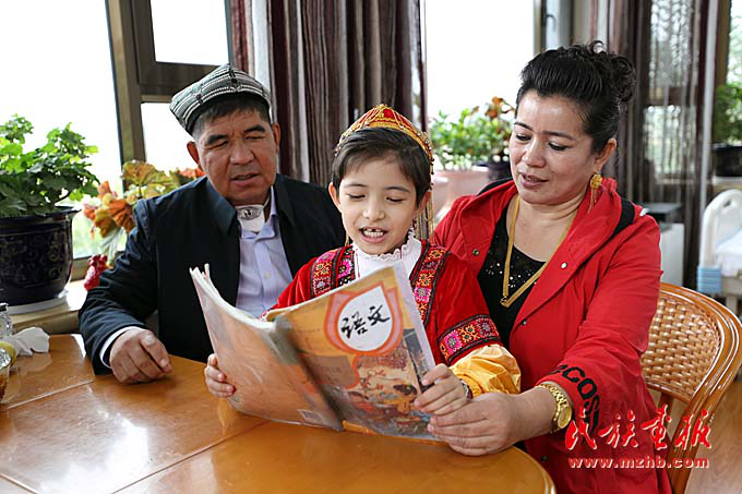 木合塔爾·艾比布拉夫婦教授7歲小女兒學習國家通用語言。