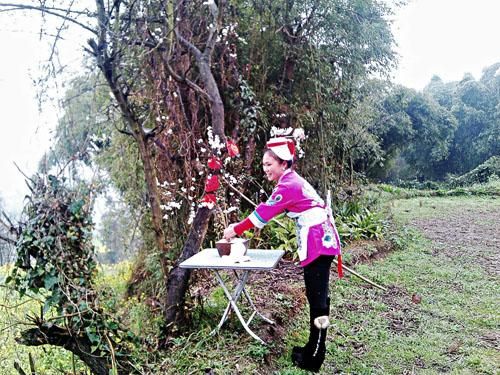 圖為一名革家婦女正在對果樹進行的“樹祭”儀式