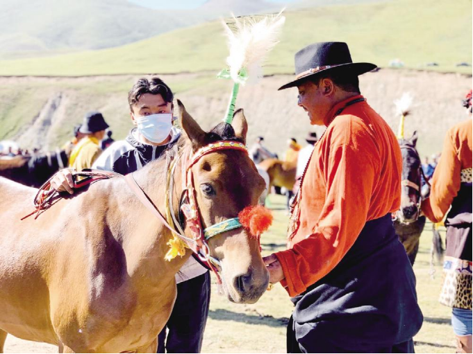 賽馬節(jié)上,主人正在細(xì)心照料賽馬。