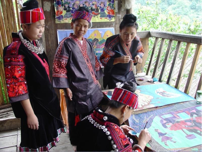 劍河現(xiàn)代民間繪畫源于傳統(tǒng)的苗族刺繡文化,是苗族刺繡文化的另一種表現(xiàn)形式和藝術(shù)升華。傳統(tǒng)的苗族文化多以服飾、歌舞為載體,并以刺繡及演唱等形式進(jìn)行表現(xiàn)和傳承。早期劍河現(xiàn)代民間畫即脫胎于具有適用性的苗族刺繡樣稿——剪紙和手繪刺繡粉本,換言之,手繪的苗族刺繡粉本便是劍河現(xiàn)代民間繪畫的雛形,劍河第一批優(yōu)秀的現(xiàn)代民間畫作者,即是原當(dāng)?shù)厥掷L粉本的能工巧匠。劍河現(xiàn)代民間繪畫多以苗族神話傳說中的故事情節(jié)和民俗節(jié)日、生產(chǎn)活動等內(nèi)容為題材入畫,素材涵蓋自然界花鳥蟲魚及人物、家畜等具體形象,造型稚拙天真,設(shè)色濃艷,對比強(qiáng)烈。作品傳達(dá)出典型的地域民俗氣息及濃厚的鄉(xiāng)土味,便是其標(biāo)志性特征。