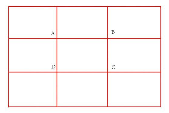 井字形構(gòu)圖和黃金分割法構(gòu)圖是什么意思呢?就是在拍攝的時(shí)候,拍攝主體也就是興趣點(diǎn),根據(jù)現(xiàn)場的情況,放在這ABCD這四個(gè)位置上,這樣看起來畫面是比較舒服,是比較協(xié)調(diào)的,比如說你拍攝一個(gè)人,人頭應(yīng)該是在交叉點(diǎn)上。